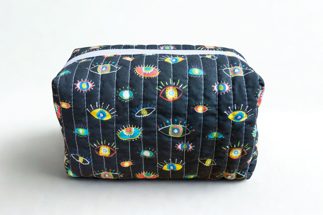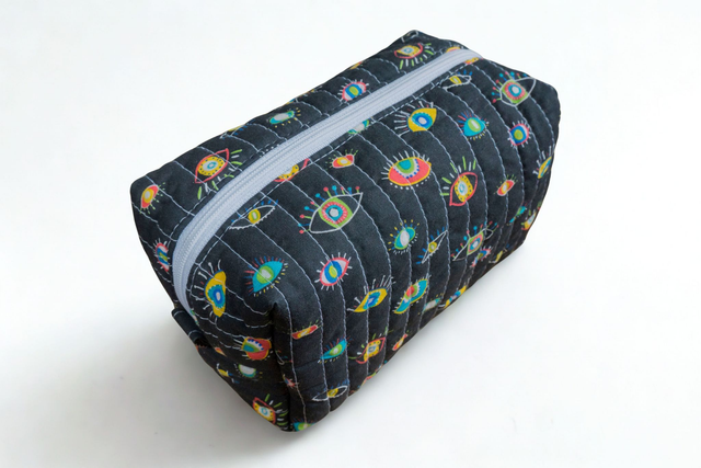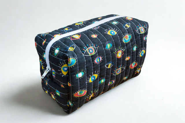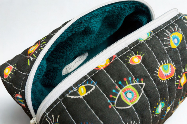 Trousse de toilette matelassée en coton, entièrement doublée dans un tissu éponge de bambou et de coton bleu canard.